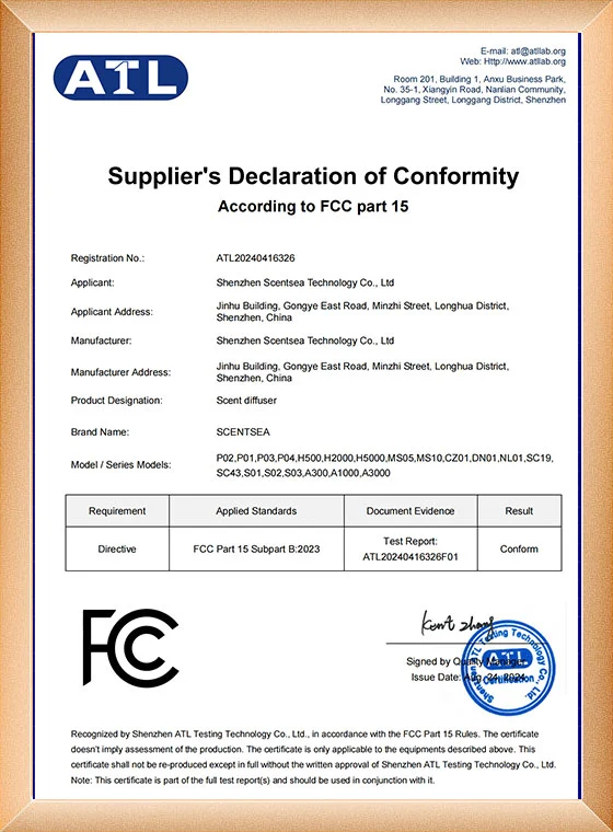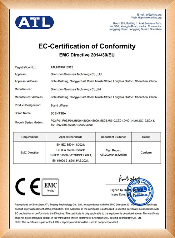 Alle Duftdiffusoren von SCENTSEA verfügen über CE-, ROHS-, FCC- und SGS-Zertifizierungen. Bisher wurden die Duftmaschinen von SCENTSEA in über 70 Ländern installiert und von unseren Kunden weithin gelobt.
